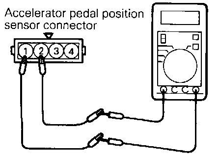 (2) Use jumper wire between terminal (2) (closed throttle position switch) on the accelerator pedal position sensor and terminal (1) (sensor ground) to connect a resistance tester.