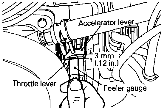 - If the feeler gauge is inserted deeper than 3 mm (.12 in.), the accelerator lever opening degree will be larger than set, thus resulting in improper adjustment.