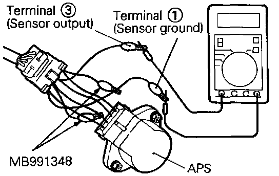 (2) Connect the digital voltmeter across the terminal (3) (sensor output) and the terminal (1) (sensor ground) of the accelerator pedal position sensor.