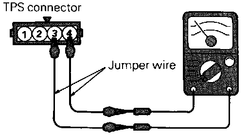 (2) Using jumper wires, connect an ohmmeter across terminal (3) (closed throttle position switch) and terminal (4) (sensor ground) of the throttle position sensor.