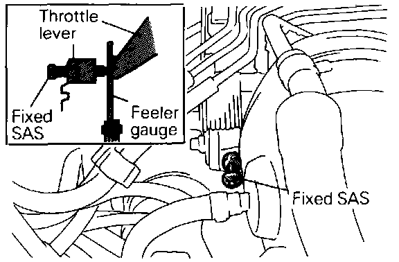(3) Insert a 0.65 mm (.0256 in.) thick feeler gauge between the fixed SAS and throttle lever.