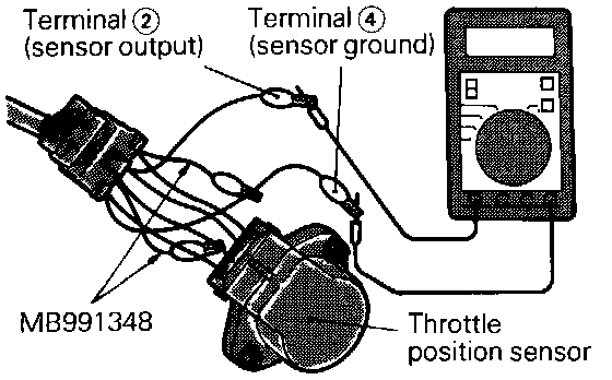 (2) Connect a digital voltmeter between the throttle position sensor terminal 2 (sensor output) and terminal (-) (sensor ground).