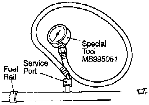 3. Connect Fuel Pressure Gauge MB995051 to fuel rail service valve.
