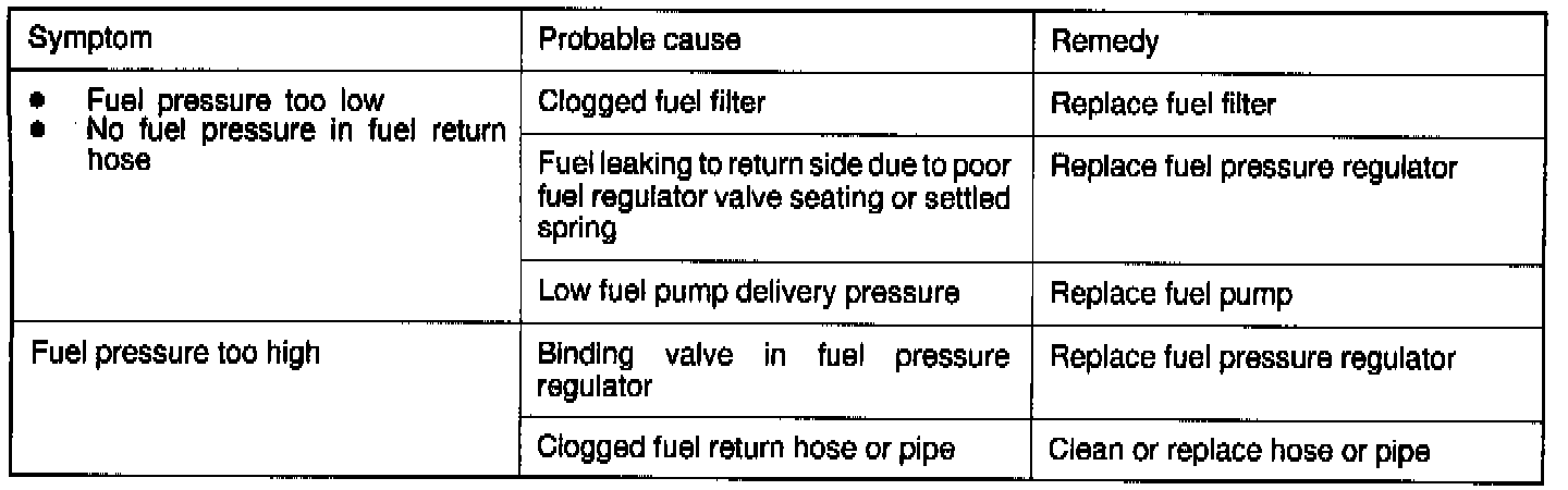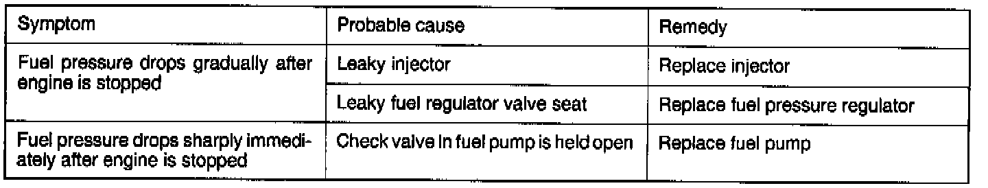 8. Turn the ignition switch off and observe fuel pressure gauge reading. Normal if the reading does not drop within 2 minutes. If it does, observe the rate of drop and troubleshoot and repair according to the table.