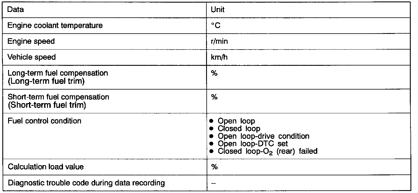 This data can be read by using the scan tool and can then be used in simulation tests for troubleshooting. Data items are as follows in the image.