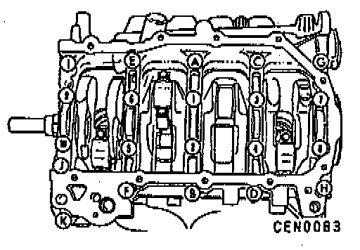 Install main bearing bedplate to engine block bolts (A thru K) finger tight, then torque each bolt to 28 Nm (20 ft. lbs.) in the sequence shown.