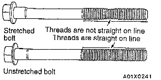 Cylinder head bolts should be carefully examined before reuse. If the threads are necked down, the bolts should be replaced.