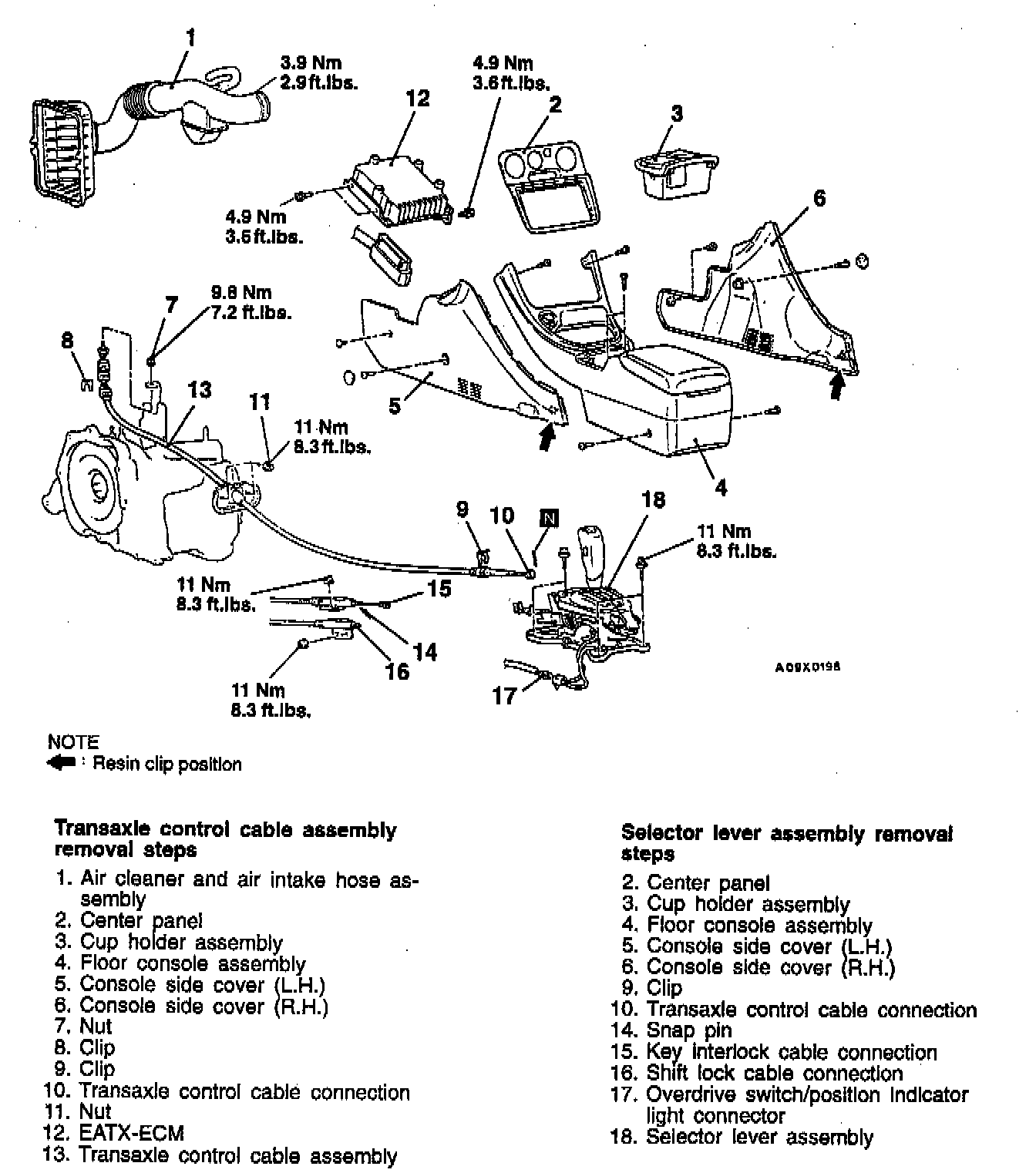 CAUTION: Supplemental Restraint System (SRS) Be careful not to subject the Air Bag Control Unit (SRS-ECU)to any shocks during removal and installation of the transaxle control cable and shift lever assembly.
