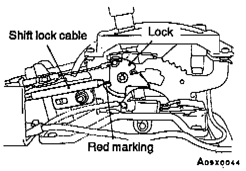 2. Fasten the shift lock cable at the position where the end of the shift lock cable is positioned above the red marking.