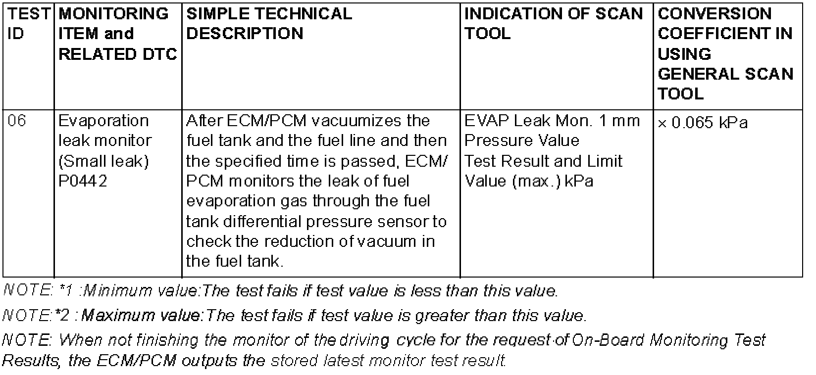 NOTE: By selecting MODE 06 using a scan tool, Test Result and Limit Value minimum (*1) or maximum (*2) about the main items of the emission control system, which the ECM/PCM monitors, can be confirmed. The value at the last monitoring is output by ECM/PCM as a test result.