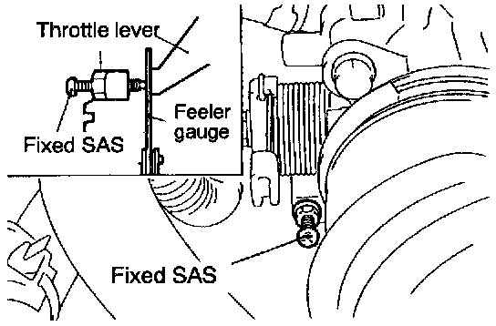 2. Insert a feeler gauge with a thickness of 0.45 mm (0.177 in.) between the fixed SAS and the throttle lever.