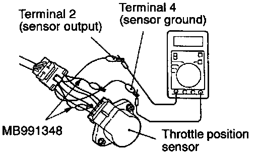 (2) Connect a digital voltmeter between the throttle position sensor terminal 2 (sensor output) and terminal 4 (sensor ground.)