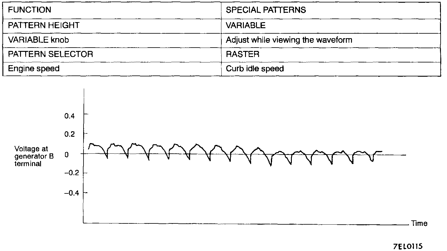 NOTE: The voltage wave-form of the generator B terminal can undulate as shown in the small box. This wave-form is produced when the regulator operates according to fluctuations in the generator load (current), and is normal for the generator.