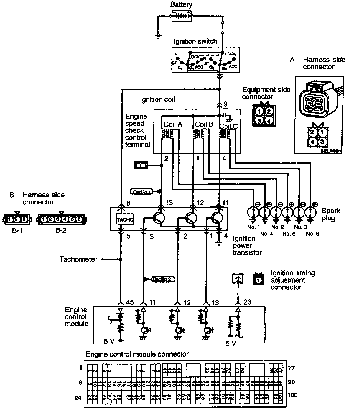 - When the ignition power transistor unit A is turned on by the signal from the engine control module, primary current flows to the ignition coil A. When the ignition power transistor unit A is turned off, the primary current is shut off and a high voltage is induced in the secondary coil A, causing the ignition plugs of No. 1 and No. 4 cylinders to spark. When the ignition power transistor unit B is turned off, the ignition plugs of No. 2 and No. 5 cylinders spark. In addition, when the ignition power transistor unit C is turned off, the ignition plugs of No. 3 and No. 6 cylinders spark.