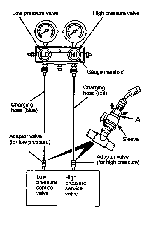 NOTE: The high-pressure service valve is on high-pressure pipe B, and the low-pressure service valve is on the low-pressure hose.