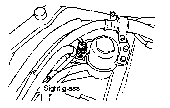 level, clean the sight glass and start the vehicle engine. Push the A/C button to operate the compressor, place the blower switch to high and move the temperature control dial to max cool. After operating for a few minutes in this manner, check the sight glass.