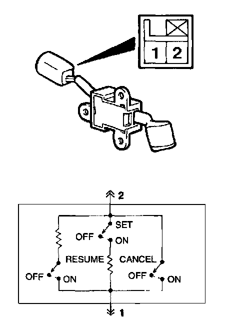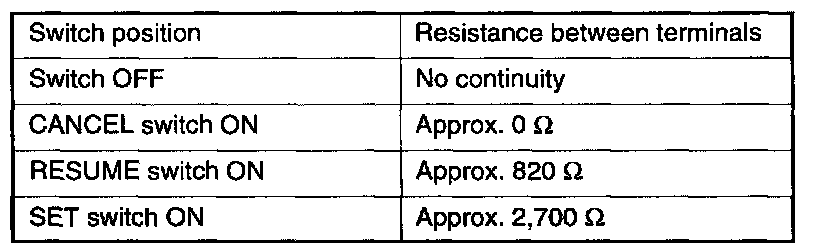 Measure the resistance between the terminals when each of the SET, RESUME and CANCEL switches is pressed. It the values measured at this time correspond to those in the table, then there is no problem.