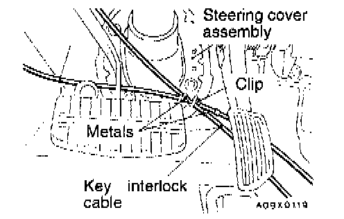 Secure the section between the metals of the shift lock cable and key interlock cable with the clip of the steering cover assembly.