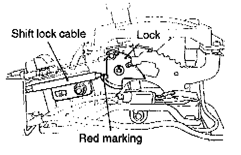 2. Fasten the shift lock cable at the position where the end of the shift lock cable is positioned above the red marking.