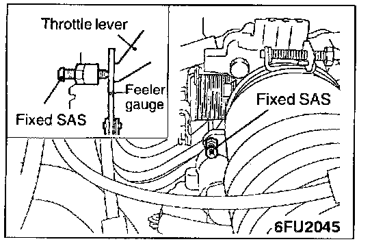3. Insert a feeler gauge with a thickness of 0.45 mm (0.0177 in.) between the fixed SAS and the throttle lever.