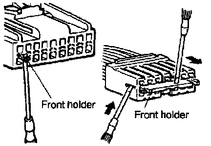A connector that engages loosely can be repaired by removing the female terminal from the connector housing and raising its lance to establish securer engagement. Removal of the connector terminal used for MFI and ELC-4 A/T control circuit can be done in the following manner.1. Insert a screwdriver [1.4 mm (.06 in.) width] as shown in the figure, disengage front holder, and remove it.