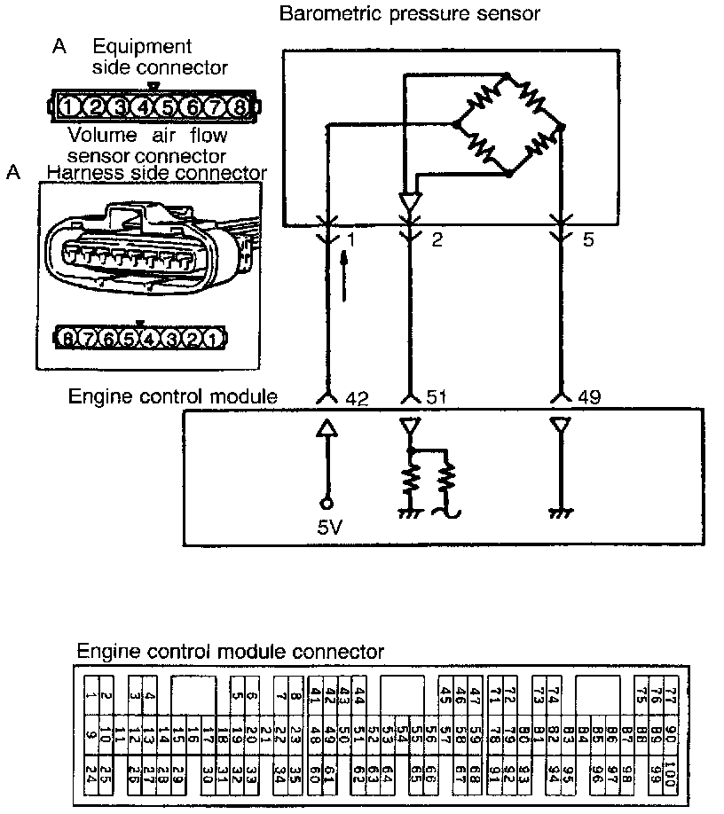 - The 5 V power in the engine control module is supplied to the barometric pressure sensor. Through the circuit in the sensor, it is grounded in the engine control module.