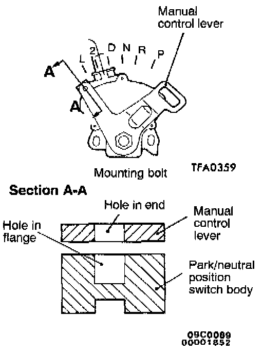 4. For adjustment, loosen the park/neutral position switch body mounting bolt, and turn park/neutral position switch body so that the end (section A-A in illustration on left) of manual control lever is aligned with the hole in park/neutral position switch body flange.