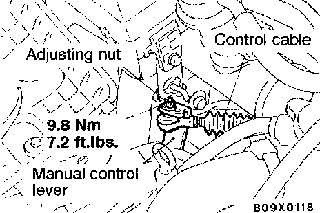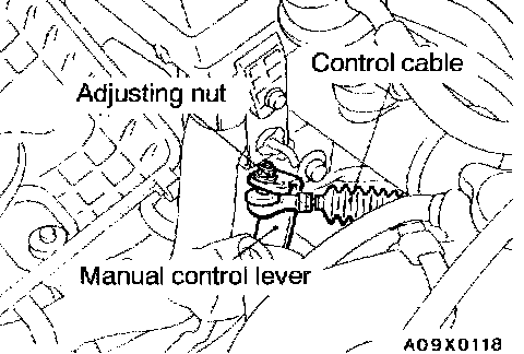 2. Loosen the control cable to manual control lever coupling adjusting nut to free the cable and lever.