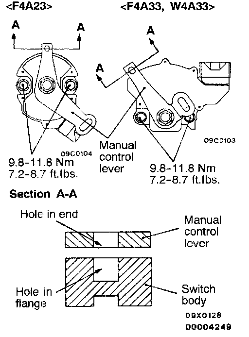 4. Loosen and adjust the park/neutral position switch body. Then the hole in the end of the manual control lever and the hole in the flange of the park/neutral position switch body must be aligned.