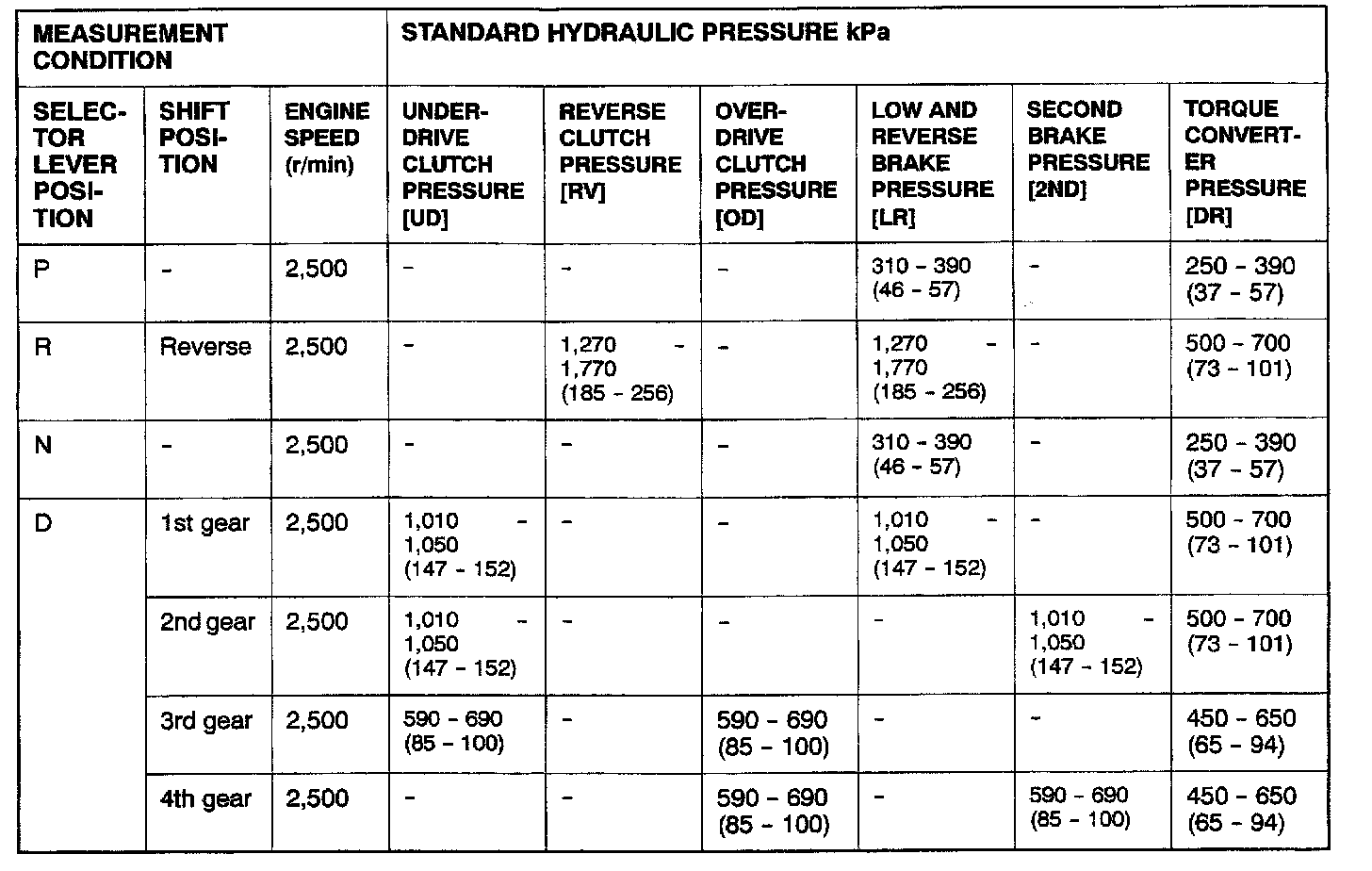 F4A42/F4A51 4-spd A/T, Standard Hydraulic Pressure: