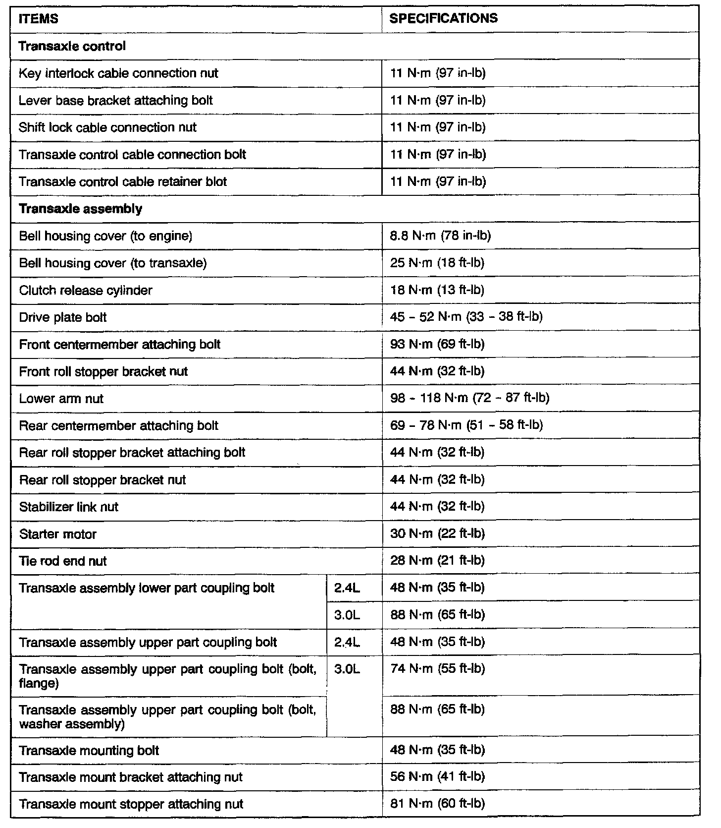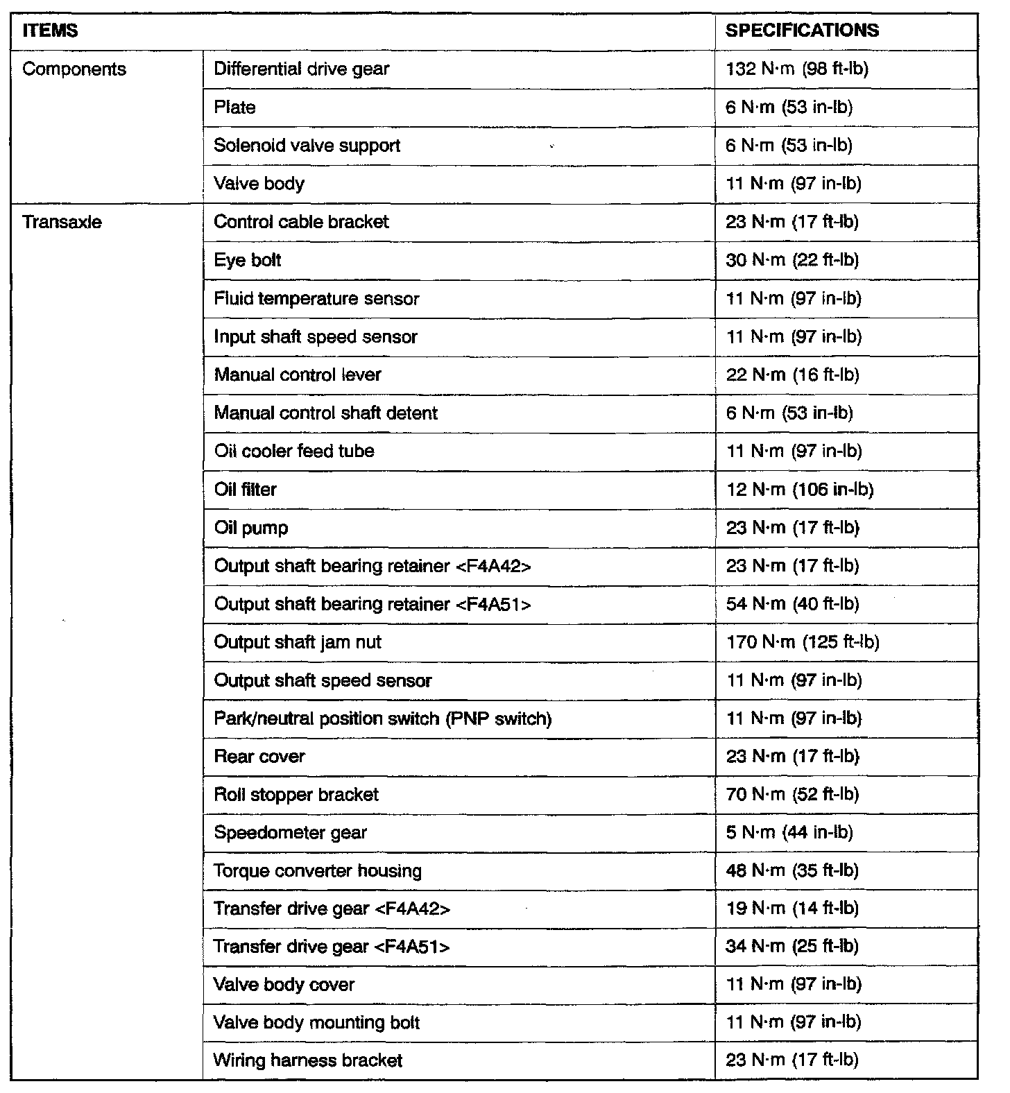 F4A42/F4A51 4-spd A/T, Transaxle Torque: