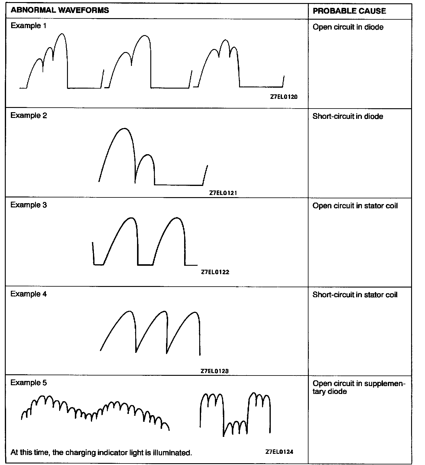 NOTE: Identification of abnormal wave forms is easier when there is a large output current (regulator is not operating). wave forms can be observed when the headlights are illuminated.)