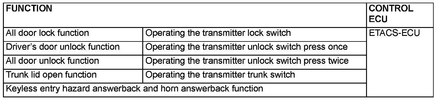 When the transmitter unlock switch is pressed twice, the ETACS-ECU energizes its door unlock relay to operate the driver's door lock actuator and the other door lock actuators for 0.25 second each in succession. Then, all doors will be unlocked.