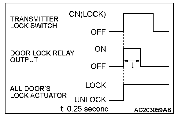When the transmitter lock switch is pressed, the ETACS-ECU energizes its door lock relay to operate all the door lock actuators for 0.25 second thus causing all doors to be locked.