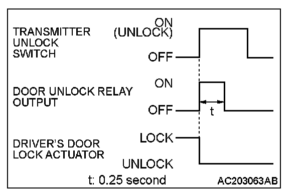 When the transmitter unlock switch is pressed once, the ETACS-ECU energizes its door unlock relay to operate the door lock actuator of the driver's door for 0.25 second thus causing only the driver's door to be unlocked.