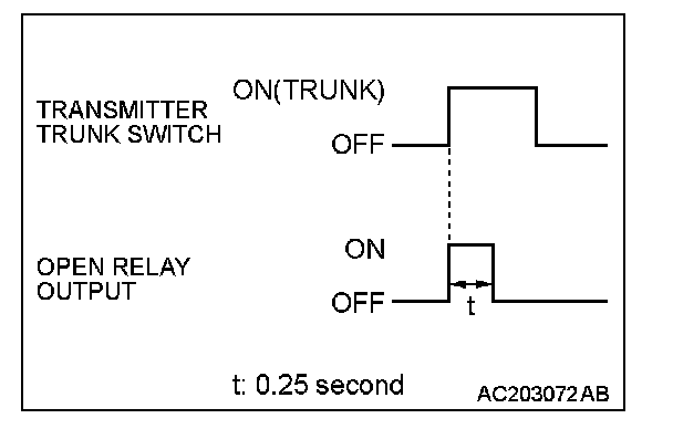 When the transmitter trunk switch is pressed, the ETACS-ECU activates the open relay output for 0.25 second and open trunk lid.
