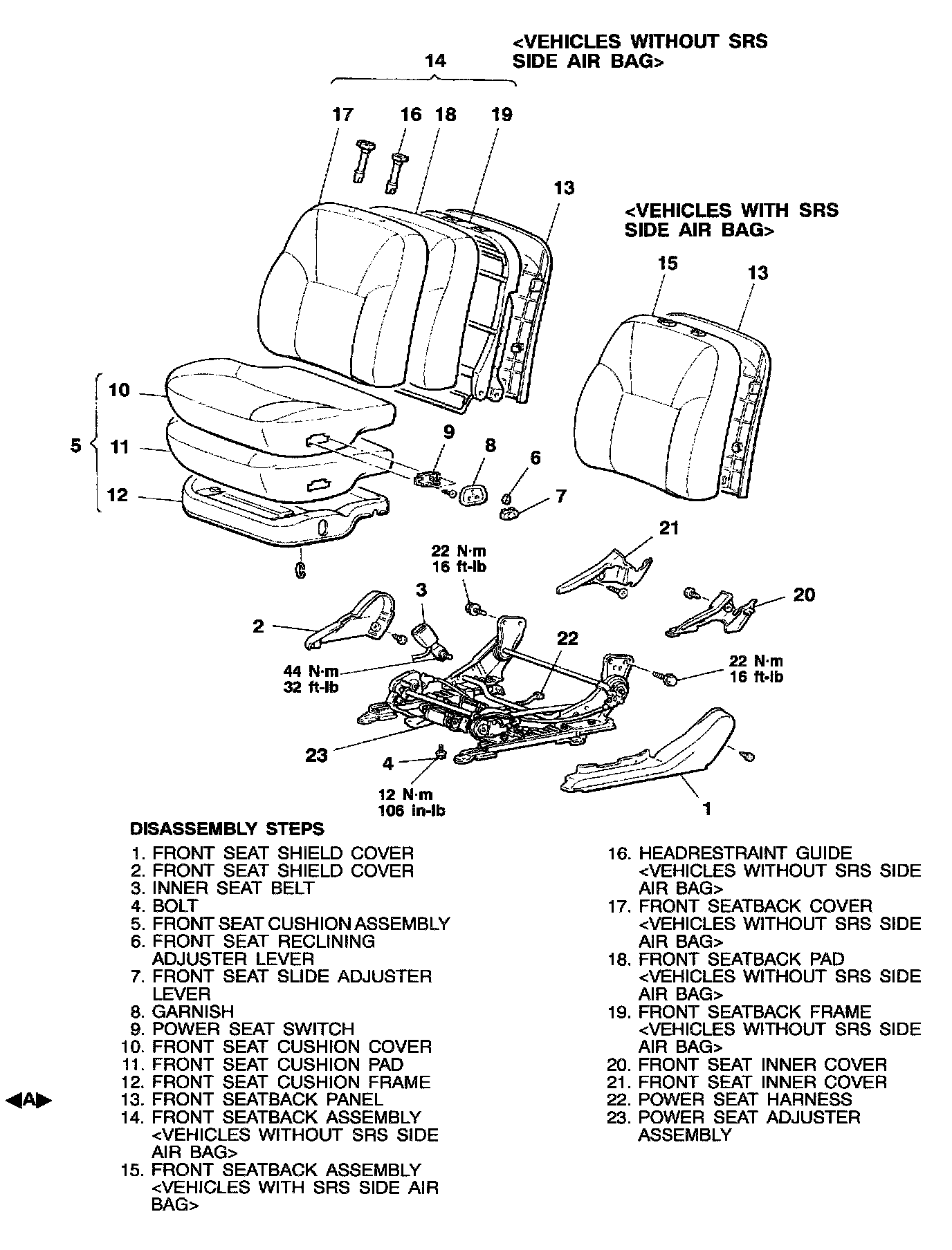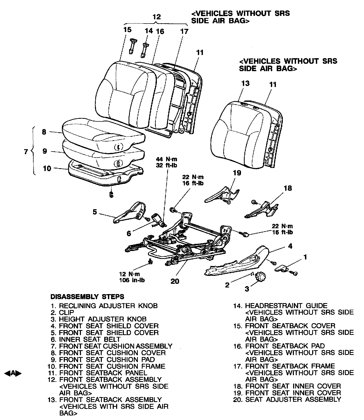 WARNING: Do not disassemble the front seatback assembly with built-in side air bag module.WITHOUT POWER SEAT