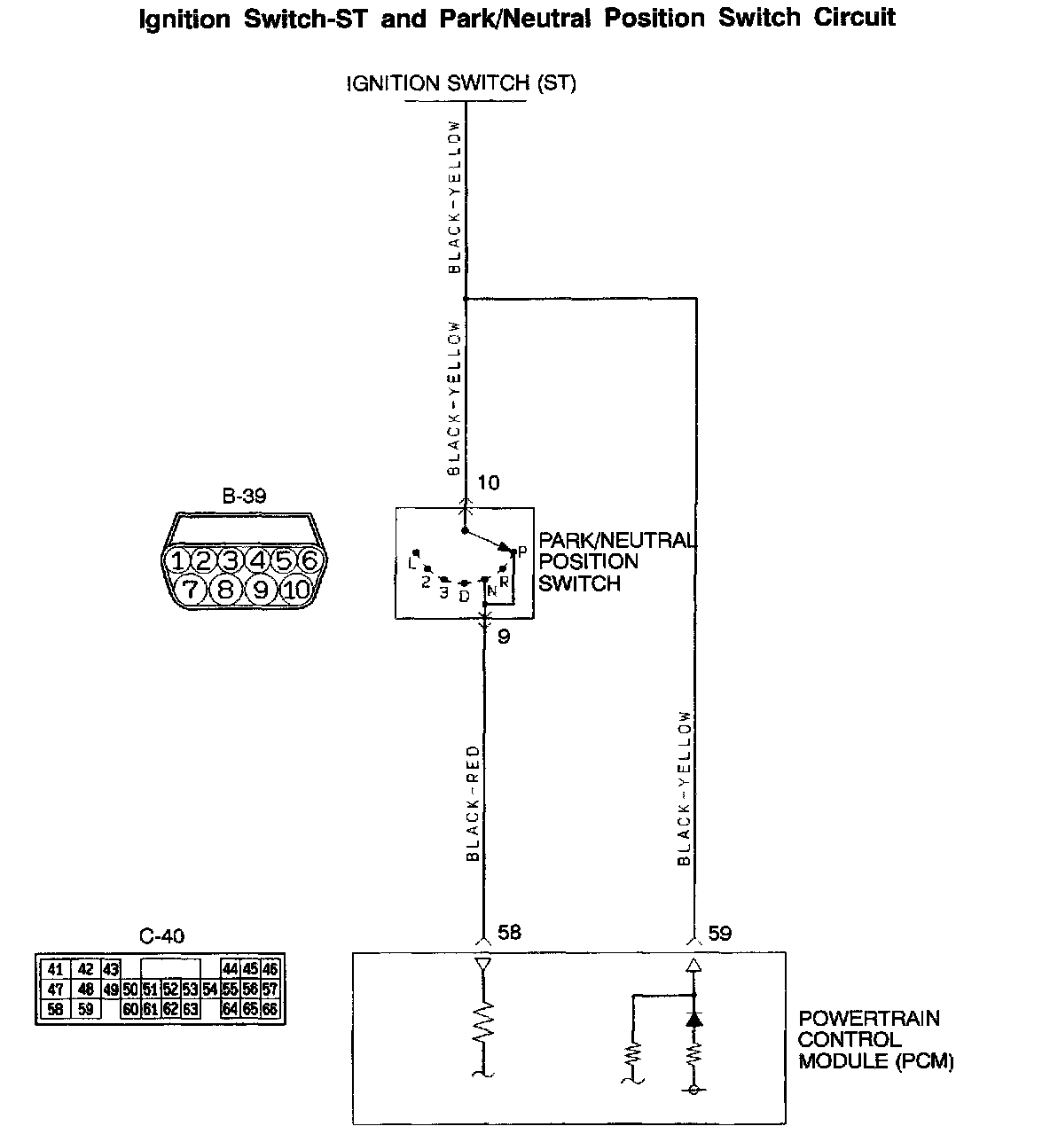 If any harness wire between park/neutral position switch connector B-39 (terminal 10) and PCM connector C-40 (terminal 59) is damaged, repair it. Then check that the malfunction is eliminated.