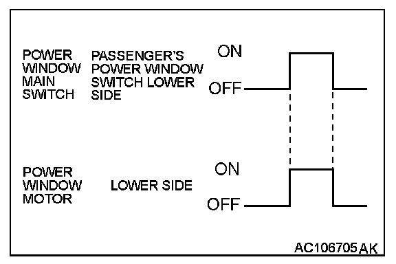 When the passenger's power window switch on the power window main switch is pushed down, the system energizes its respective power window motor, and then passenger's window glass lowers.