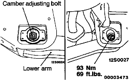 2. Adjust by turning the camber adjusting bolt (mounting bolt for the lower arm and rear crossmember).