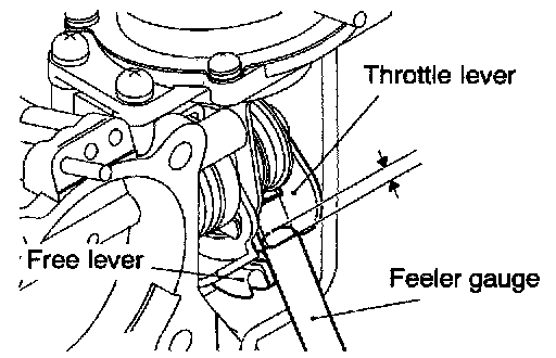 NOTE: The throttle lever opening will widen larger than the set opening if the feeler gauge is inserted more than 3 mm (0.12 in.), and adjustment will be impossible.