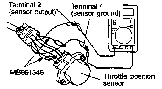 2. Connect a digital voltmeter between the throttle position sensor terminal 2 (sensor output) and terminal 4 (sensor ground.)