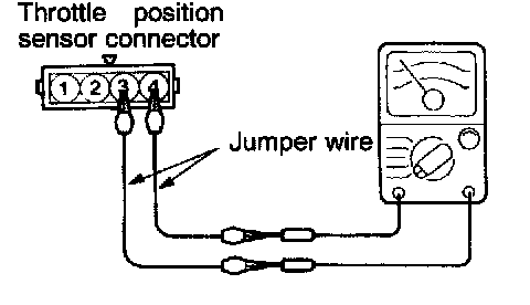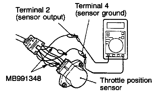 2. Connect a digital voltmeter between the throttle position sensor terminal 2 (sensor output) and terminal 4 (sensor ground.)