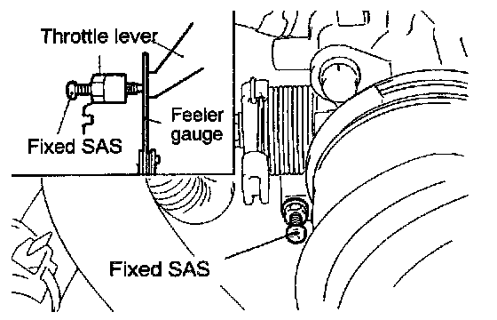 2. Insert a feeler gauge with a thickness of 0.45 mm (0.177 in.) between the fixed SAS and the throttle lever.