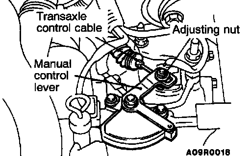 6. Gently pull the transaxle control cable in the direction of the arrow, and then tighten the adjusting nut.