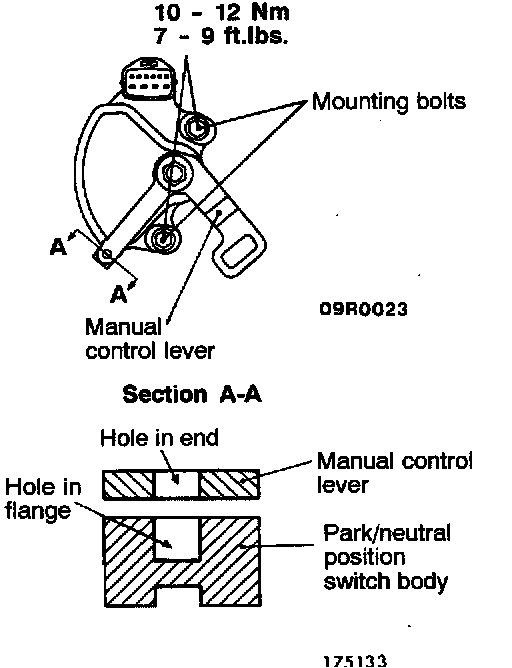 4. Loosen the park/neutral position switch body mounting bolts and turn the park/neutral position switch body so the hole in the end of the manual control lever and the hole (cross section A-A in the figure shown) in the flange of the park/neutral position switch body flange are aligned.