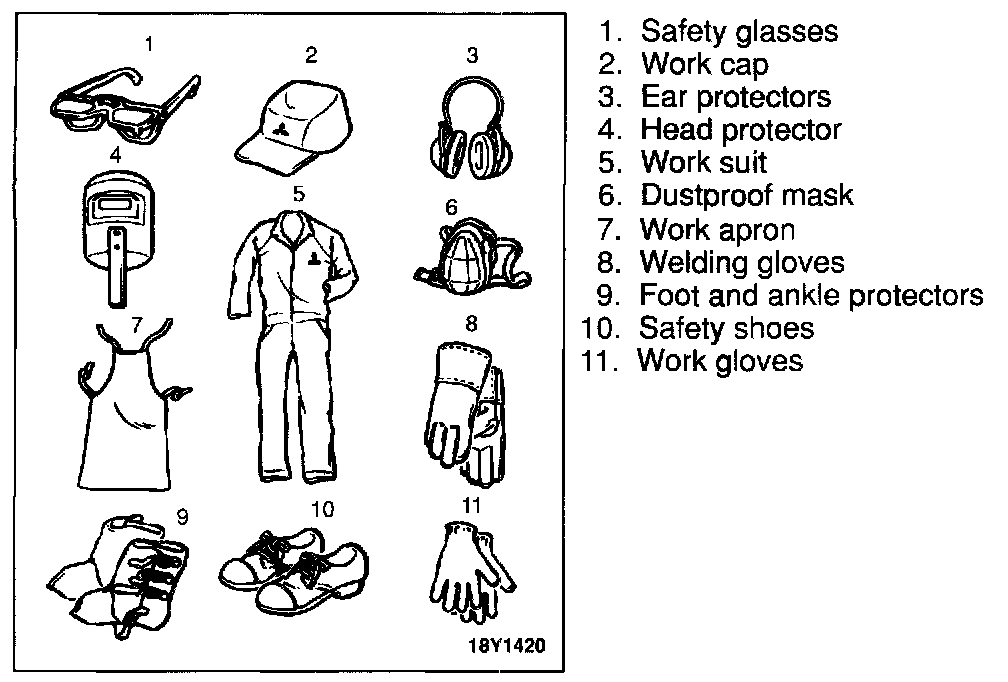During body repair work, a work suit, a work cap and safety shoes should be worn at all times. Depending on the work being done, safely glasses, gloves, ear protectors, a dust-proof mask, etc., should also be worn as needed.