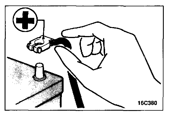 When the body is used as the ground during welding for body repairs, be absolutely sure to first disconnect the battery's positive (+) cable.