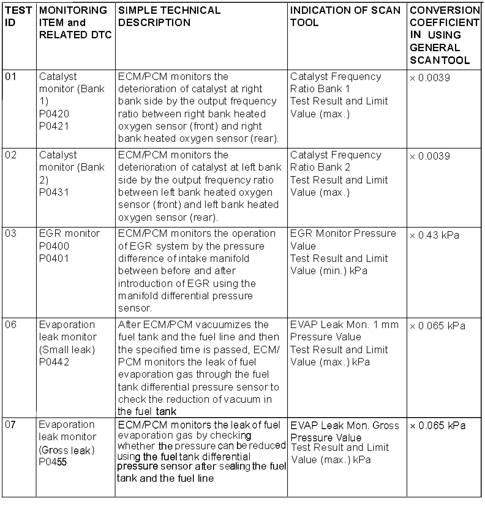 NOTE: By selecting MODE 06 using a scan tool, Test Result and Limit Value minimum (*1) or maximum (*2) about the main items of the emission control system, which the ECM/PCM monitors, can be confirmed. The value at the last monitoring is output by ECM/PCM as a test result.