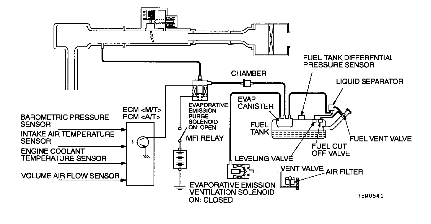 An EVAP ventilation solenoid is provided between the EVAP canister and atmosphere to monitor for OBD-II EVAP leaks. This solenoid is normally OFF. However, it turns ON when monitoring the OBD-II EVAP leaks and shuts off the atmosphere flow to the EVAP canister. Then the fuel tank differential pressure sensor monitors the fuel vapor pressure to detect OBD-II EVAP leaks. The fuel vent valve and the leveling valve prevent fuel from being overfilled. The fuel vent valve and the leveling valve valve prevents fuel leaks just if the vehicle is rolled over in an accident.
